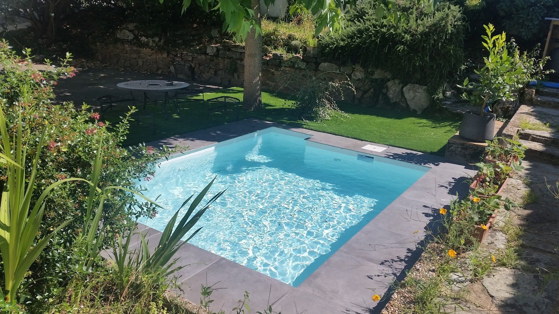 3/7m, liner gris clair, eau salée, 29°C, traitement de l'eau automatique !