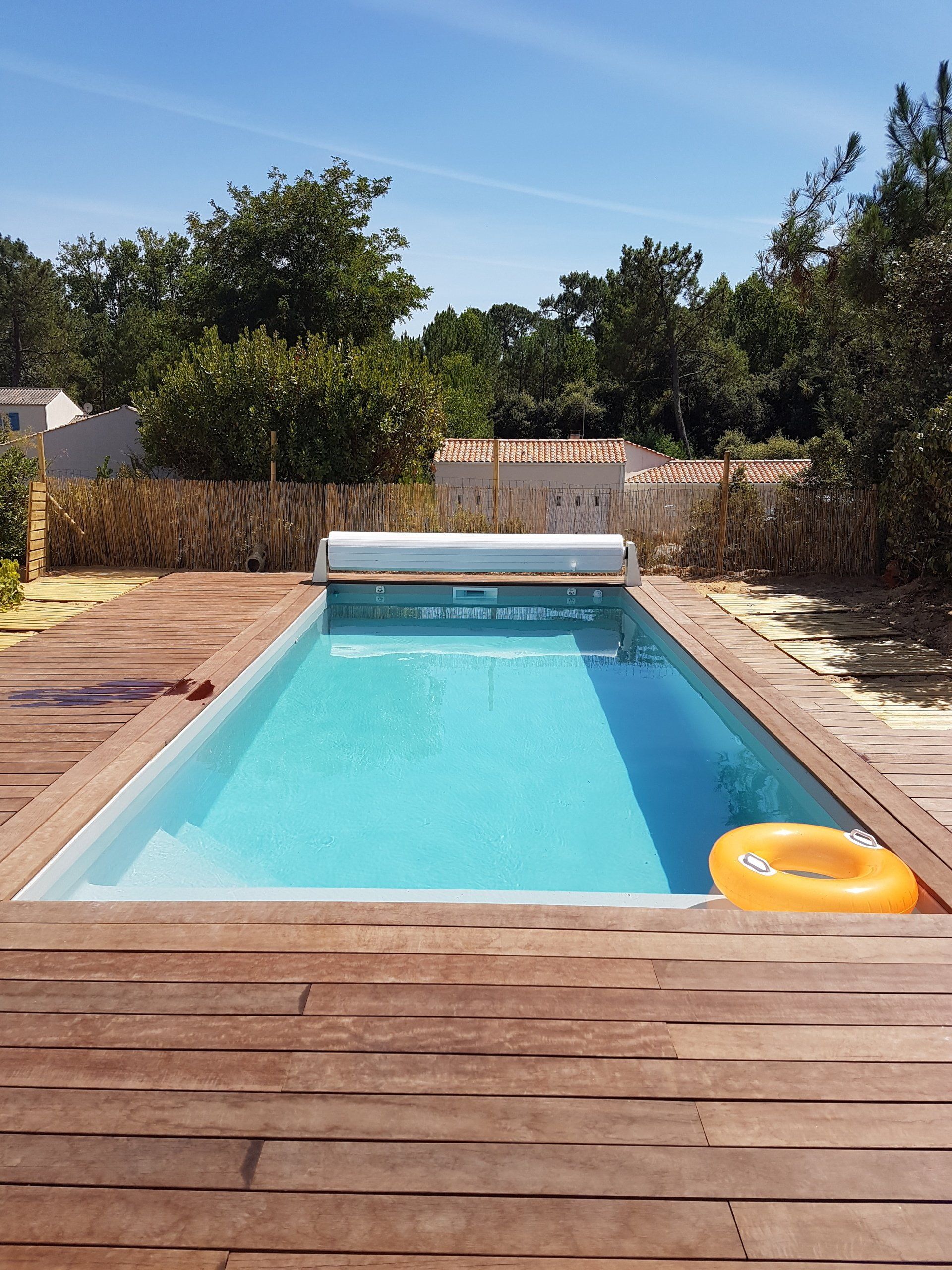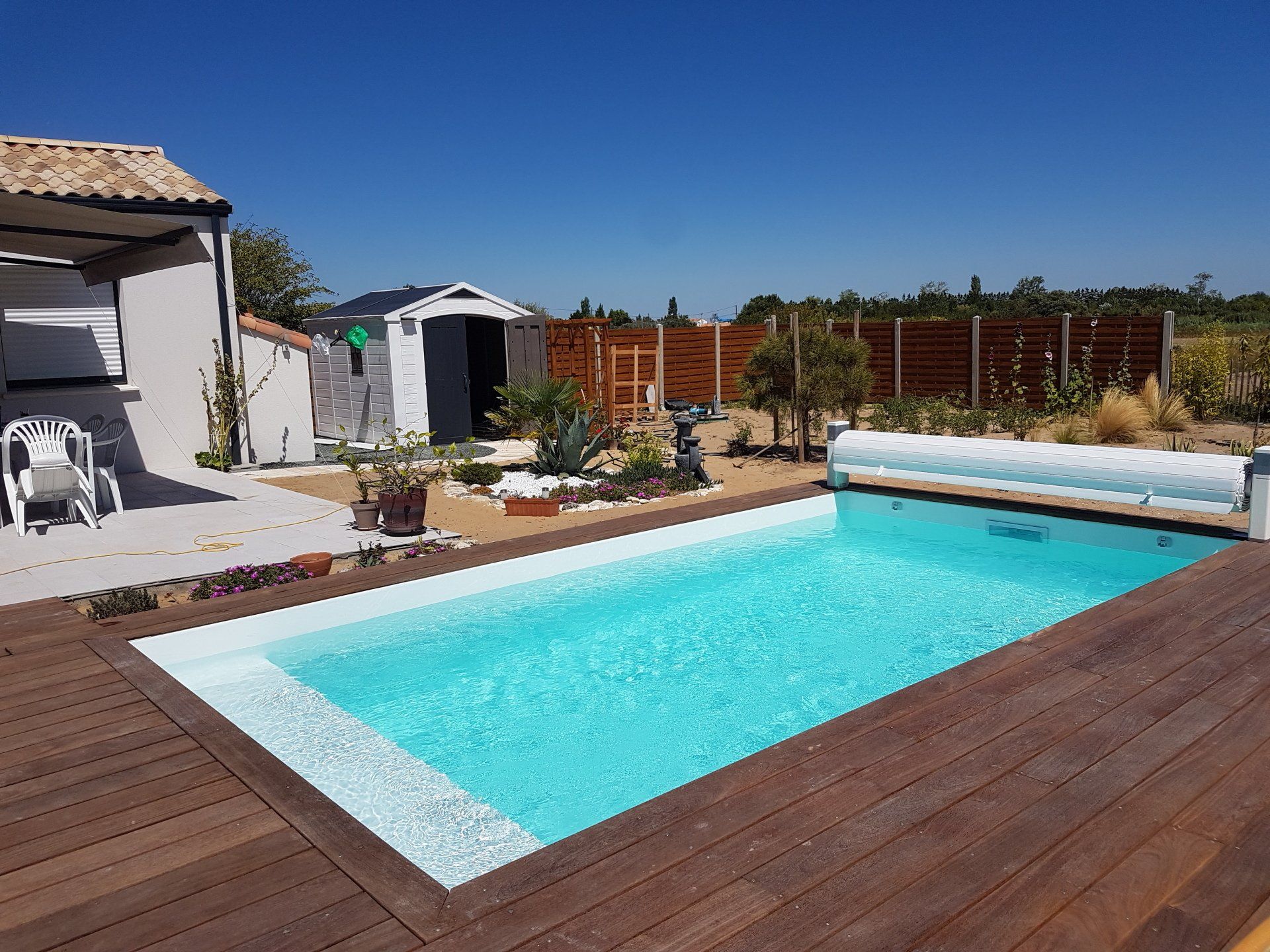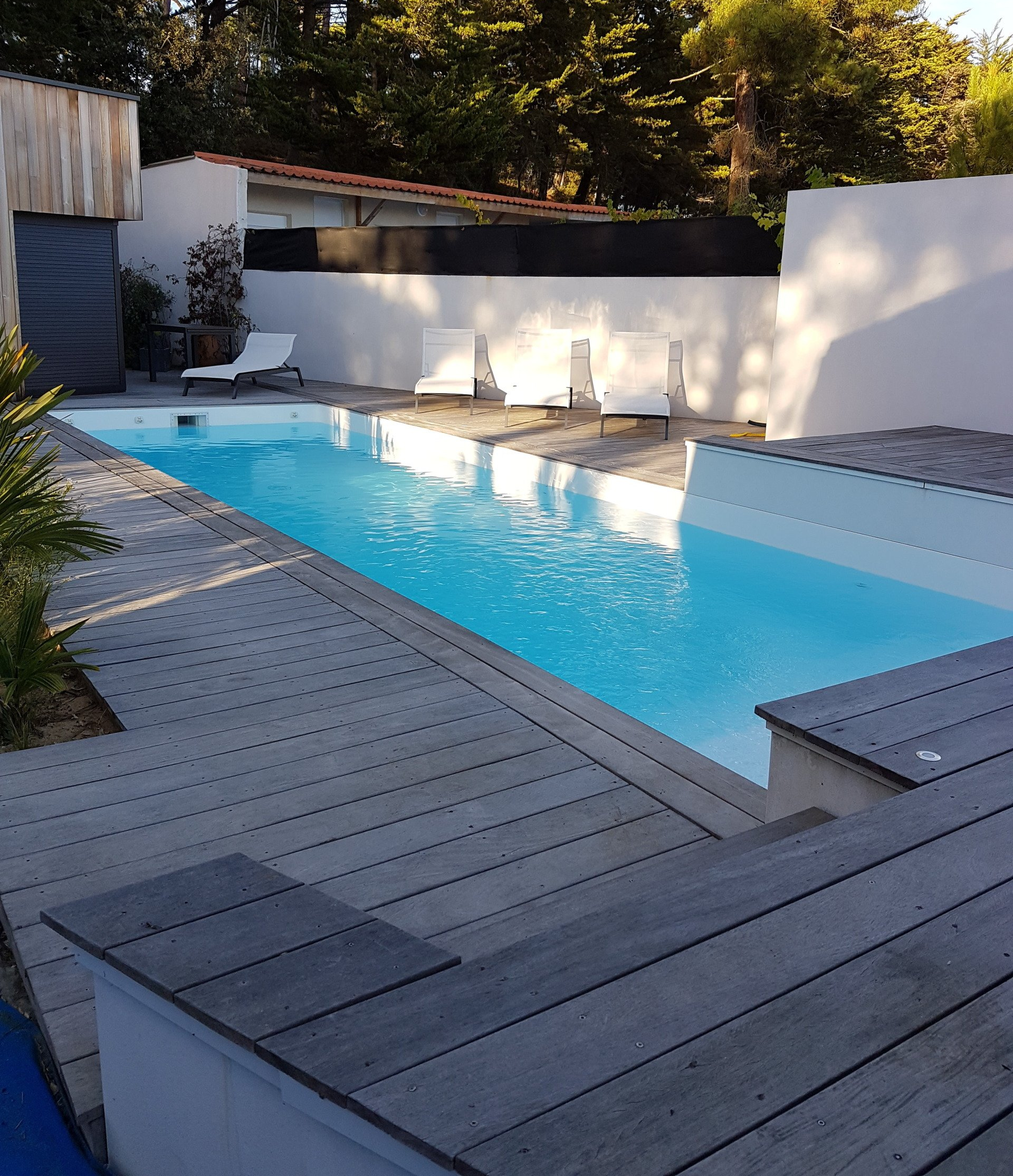 Unik hot Pool 4x10 escalier droit, plage immergée... volet imergé installé dans l'escalier et liner blanc pour une eau cristalline.... filtration sable et traitement au sel ! Eau 29°c ...