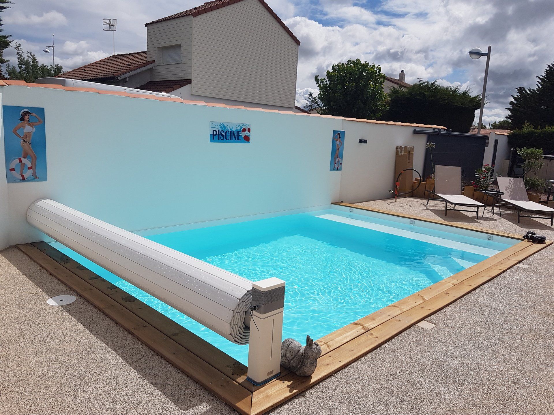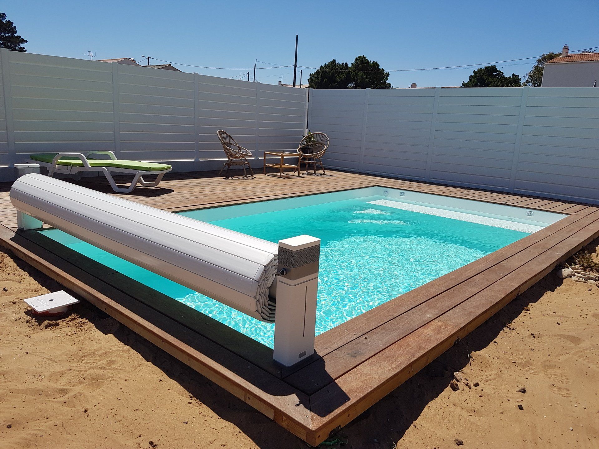 Unik hot Pool 4x8 escalier droit, plage immergée... volet hors sol et liner blanc pour une eau cristalline.... filtration sable et traitement au sel ! Eau 29°c ...